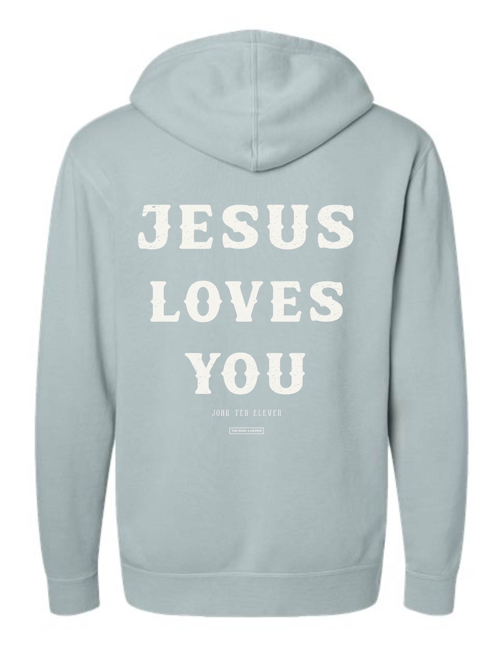 This 80/20 cotton/poly hoodie displays the message of His great love for all.